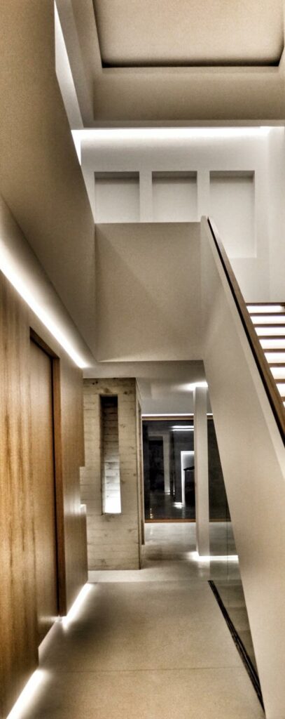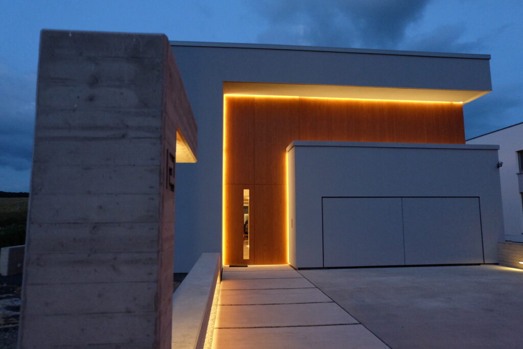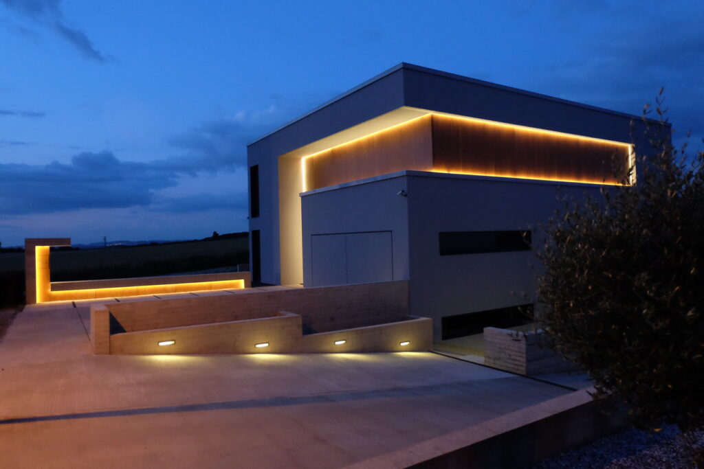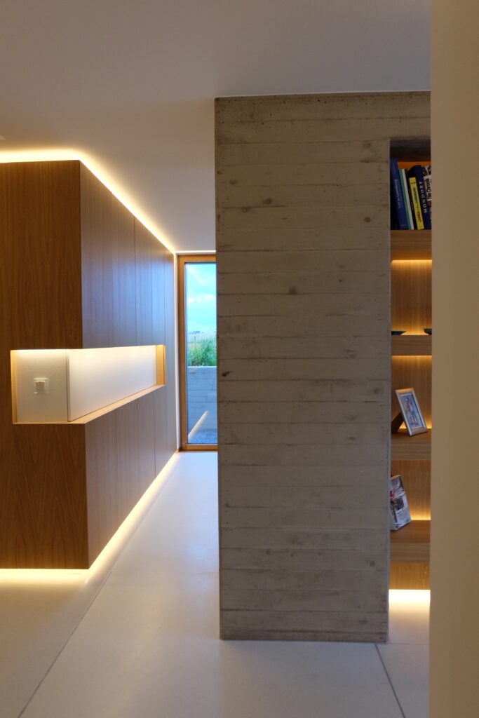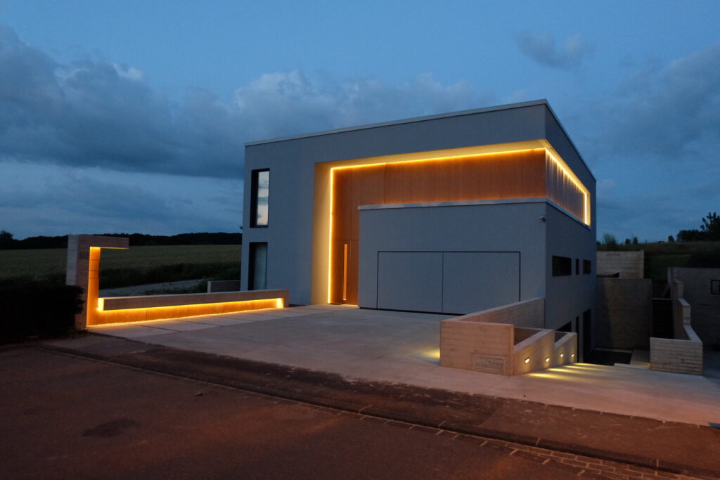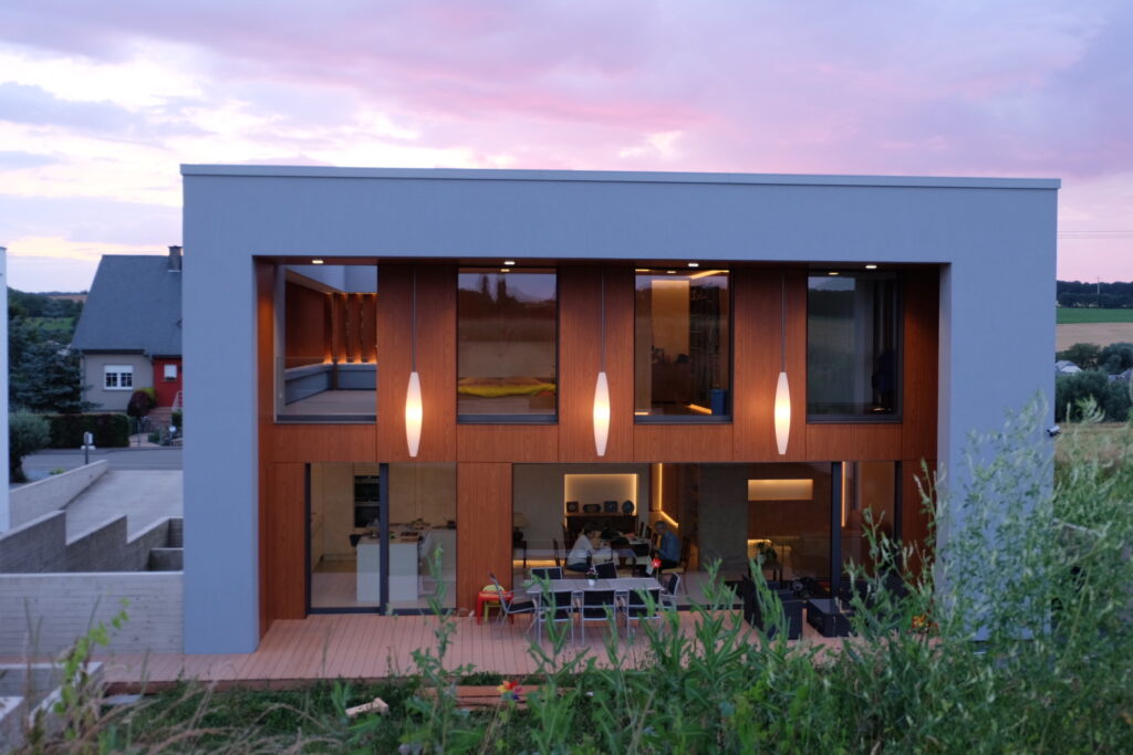 This passive house, built to AAA energy standards, blends light, material and landscape in an atmosphere that becomes almost magical at dusk. Designed to reflect the occupants’ daily habits, it structures its spaces through subtle semi-partitions, generous openings toward the surrounding fields, and a restrained palette of materials, exposed concrete, oak and light tones. A timber frame, recessed volumes, a patio screened by pivoting wooden slats, invisible built-in storage and carefully integrated lighting define an architecture that is precise, warm and functional. Built exclusively with local companies and equipped with an innovative thermal system, the house follows a sustainable approach that combines comfort, energy efficiency and a strong architectural identity.