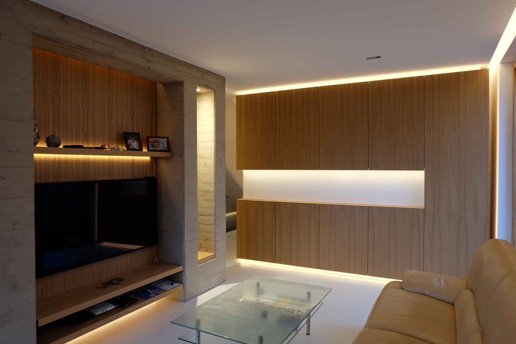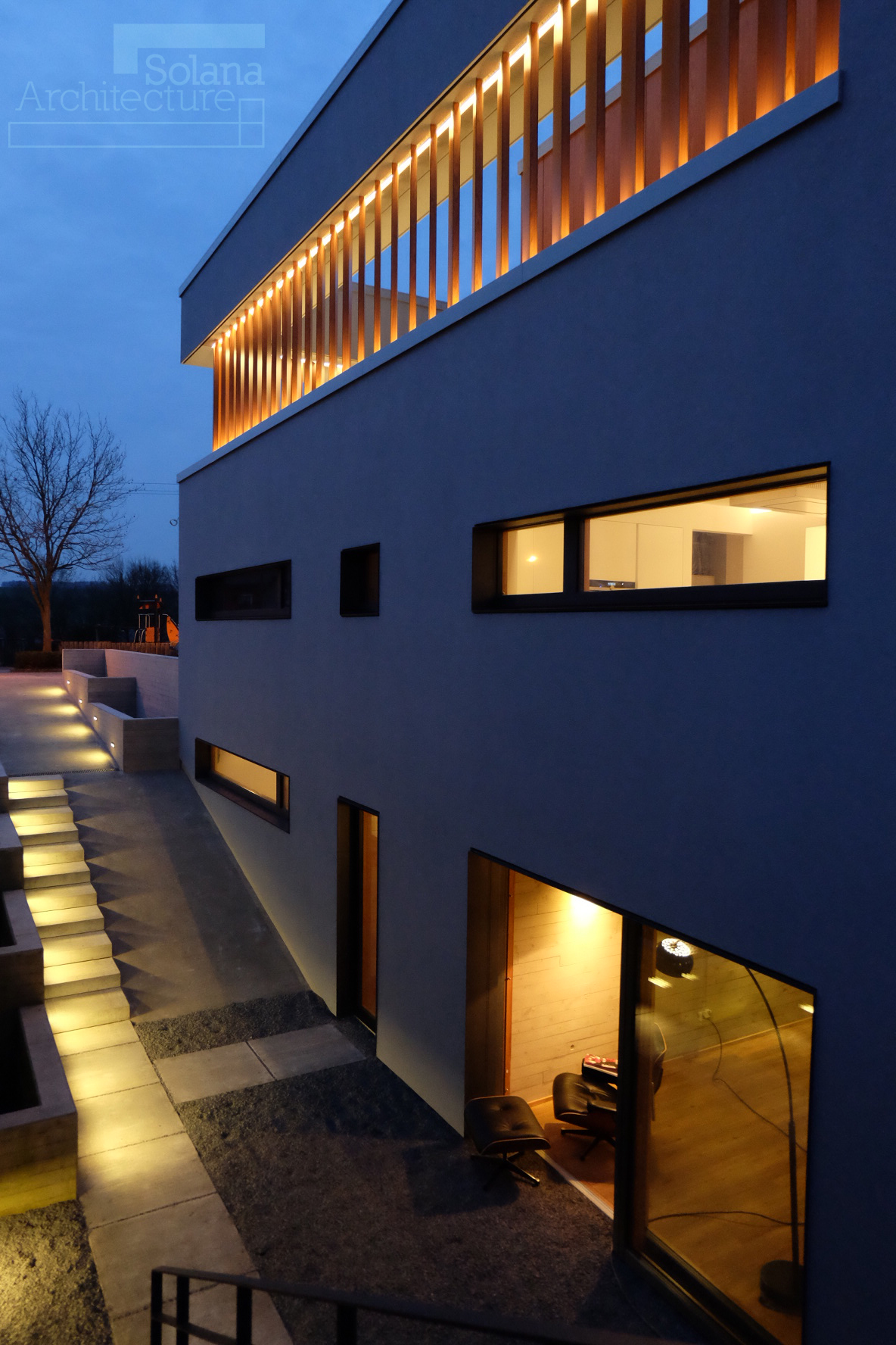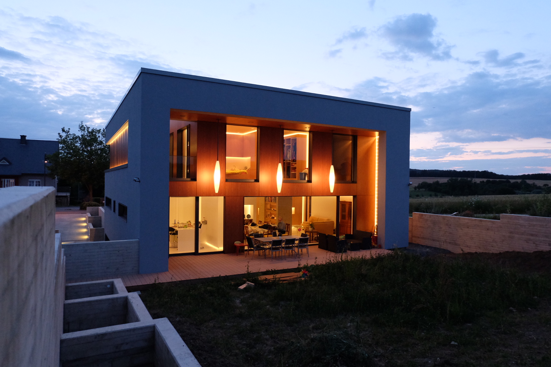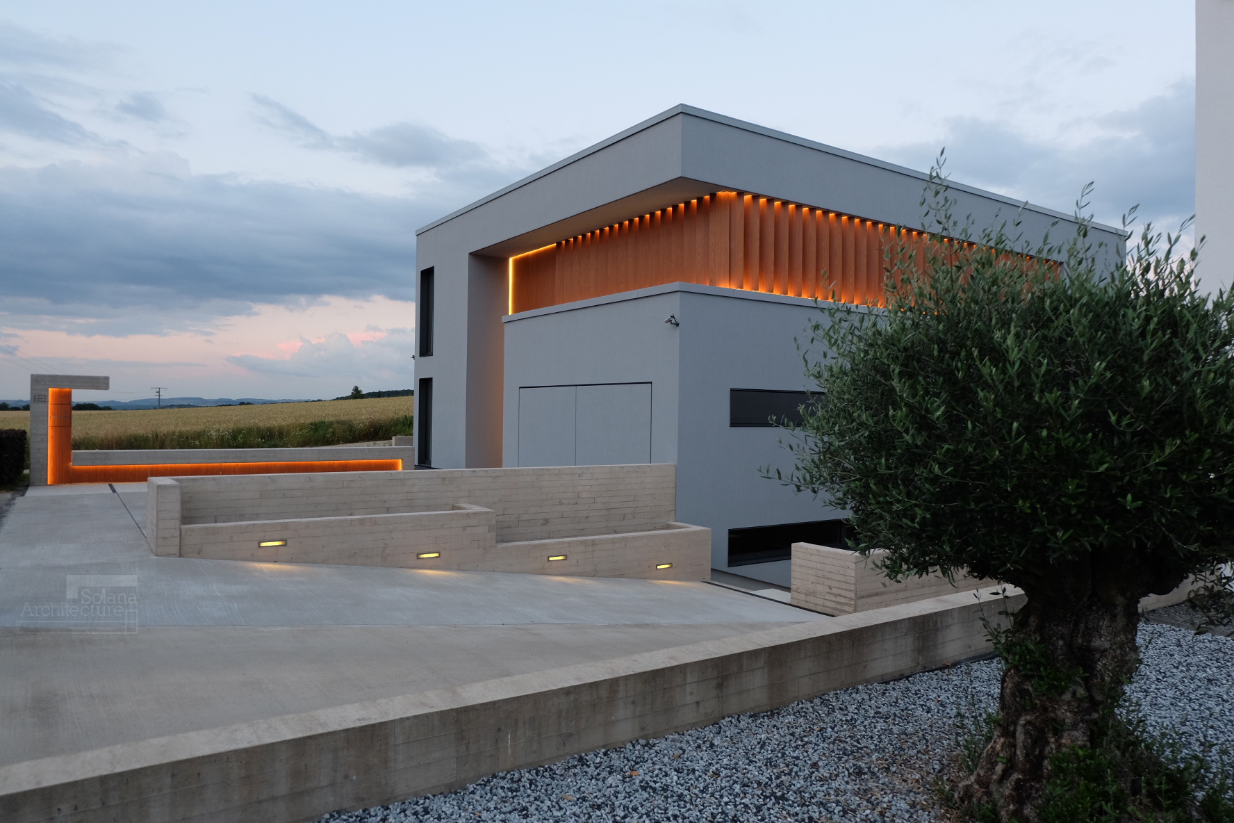This passive house, built to AAA energy standards, blends light, material and landscape in an atmosphere that becomes almost magical at dusk. Designed to reflect the occupants’ daily habits, it structures its spaces through subtle semi-partitions, generous openings toward the surrounding fields, and a restrained palette of materials, exposed concrete, oak and light tones. A timber frame, recessed volumes, a patio screened by pivoting wooden slats, invisible built-in storage and carefully integrated lighting define an architecture that is precise, warm and functional. Built exclusively with local companies and equipped with an innovative thermal system, the house follows a sustainable approach that combines comfort, energy efficiency and a strong architectural identity.