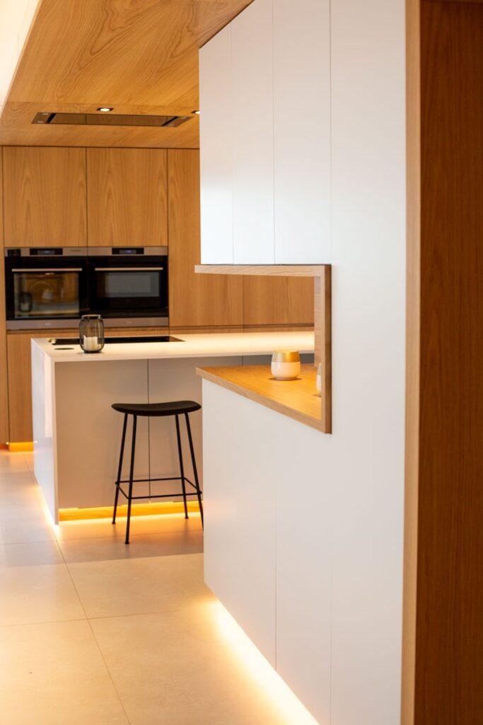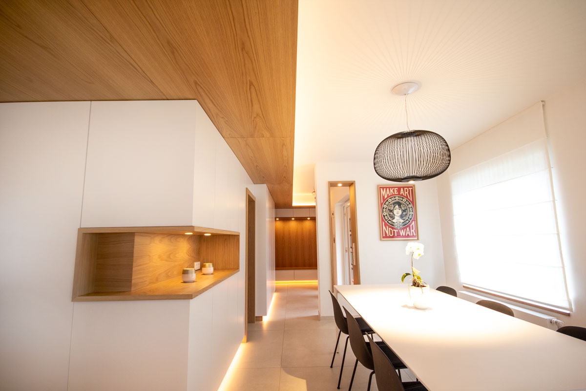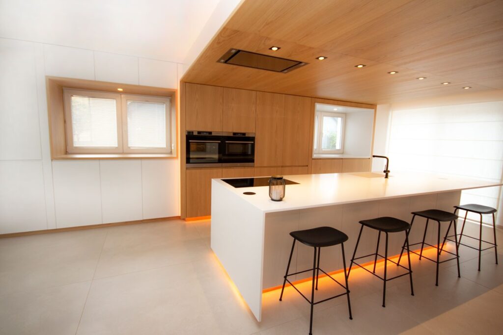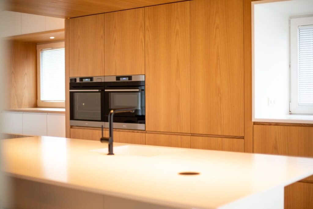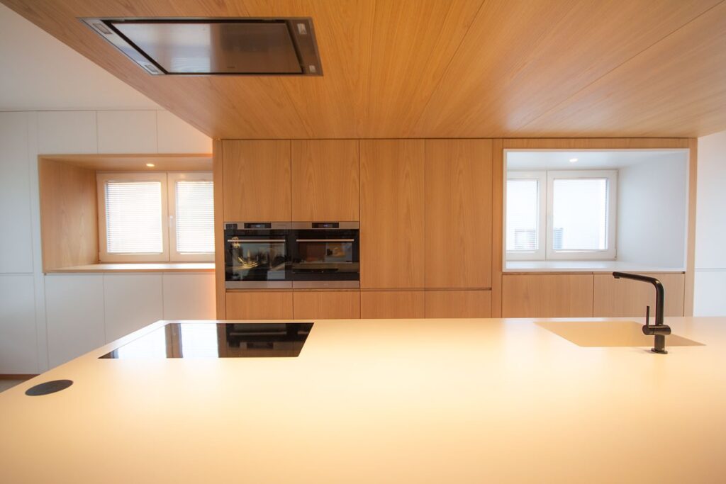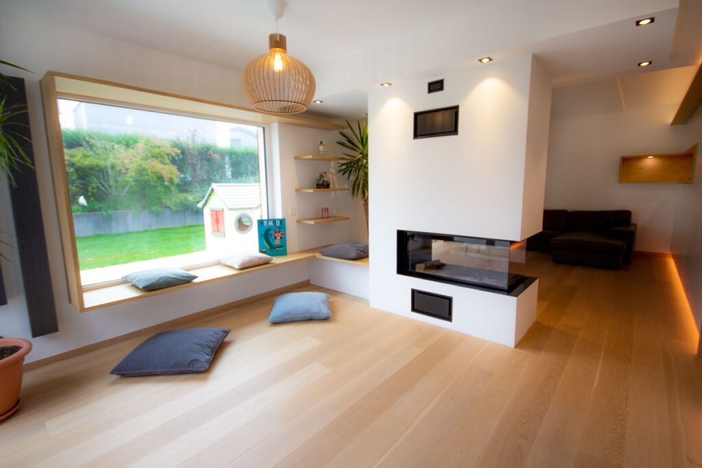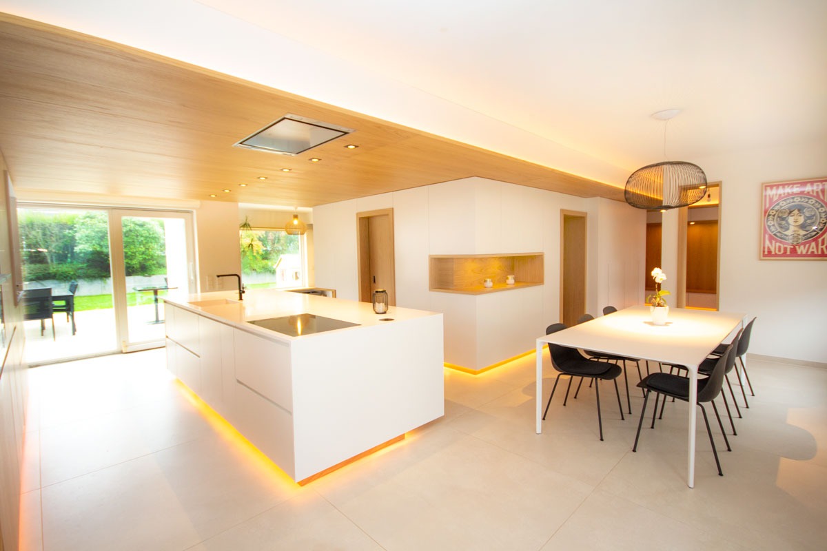 This renovation project redefines the ground floor of a family home in the canton of Luxembourg. After resolving severe humidity issues linked to the original construction, the transformation focused on reorganising the living spaces around a central kitchen, now the heart of daily life. This new layout creates fluid circulation, abundant natural light and clear connections between the entrance, dining room, play area and living room, while preserving intimacy where needed through elements such as a lowered ceiling and a wood-burning stove. Generous openings to the garden, the warm presence of wood and custom-made storage contribute to calm, practical and welcoming interiors. Designed to support family life, the result offers comfort, clarity of use and a strong sense of togetherness in a bright, functional and harmonious home.